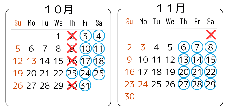 月あ | 火あ | 水あ | 木あ | 金あ |