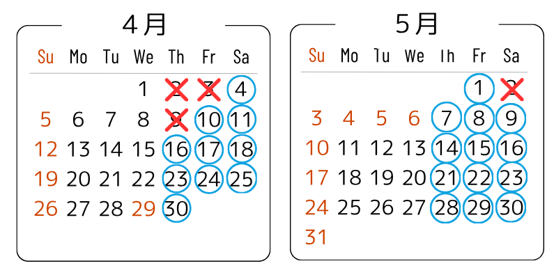 | 月あ | 火あ | 水あ | 木あ | 金あ |