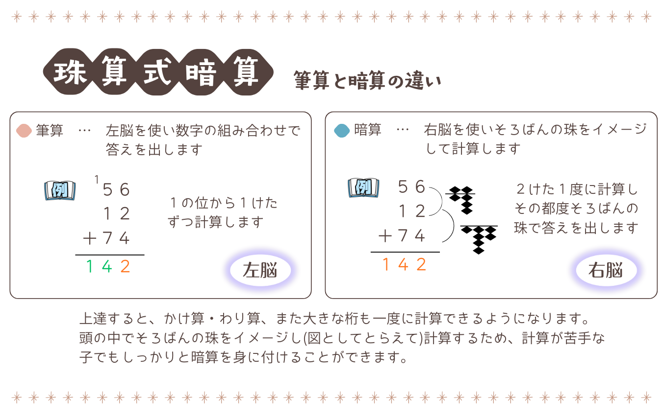 そろばん学習は、珠算式暗算を習得することができ、圧倒的な計算力が身に付きます。珠算式暗算は珠をイメージして計算するため、右脳(ひらめき・イメージ記憶・創造性・芸術性)を使います。学校教育は左脳(読み書き・分析・論的思考)中心の学習です。学校では左脳を、そろばんでは右脳を鍛えることで、脳機能を最大限に向上させることができます。小さいうちに右脳と左脳をバランスよく育てると、将来に役立つ能力をたくさん身に付けることができます。